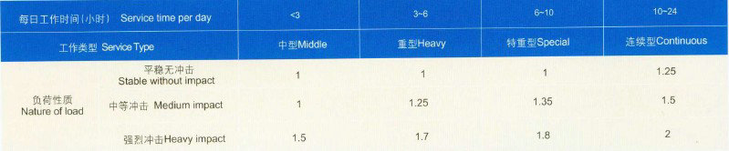 a.減速器入軸功率為電機功率的0.94—1.4倍時,即按單級選用方法計算后,K1。K2之乘積小于1.4者,可以電機全容量選用。以”○”表示,并定名為基本規(guī)格。常用于平穩(wěn)連續(xù)或輕度;中擊的工作負荷。