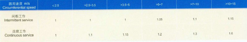 b.減速器入軸功率為電機功率的1.4—2.5倍,即按單級選用方法計算后,K1.K2之乘積小于2.5者,可以電機全容量選用。以“△”表示,多用于中等沖擊或嚴重沖擊的工作負荷。